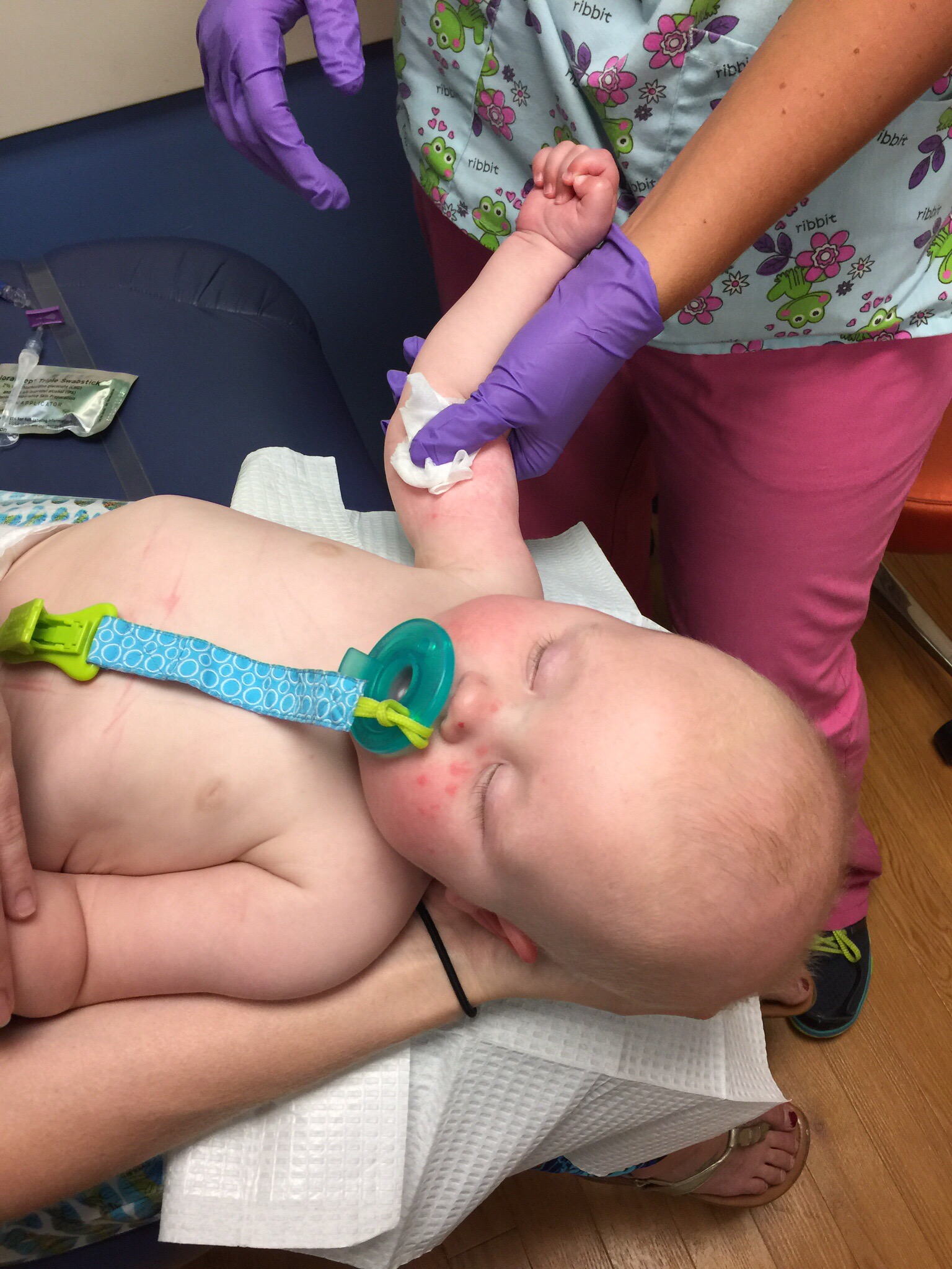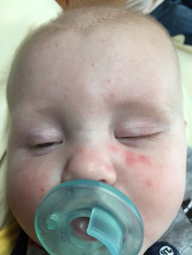Monday night Bodi did not sleep well at all. He woke up at 11:30 and was screaming in pain. I attributed it to teething. I gave him some motrin and snuggled him the rest of the night. He would wake up every hour or so and just screamed. It was not a fun night. When I changed him in the morning I noticed his back had broken out in a really bad rash. I called the pediatrician and made an appointment. By the time we arrived at the doctors office the rash had broken out all over his body. The doctor thinks it may have been an allergy to eggs, which I just gave Bodi on Sunday and Monday. So we are cutting eggs out of his diet, and he is on a topical steroid to ease the rash. He woke up much happier and his rash has gone down.